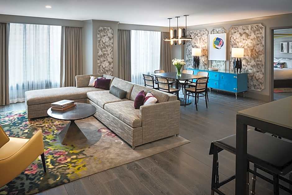 This suite features an entry area with hardwood floors, custom carpets, artwork, walnut and oak furnishings, with touches of polished chrome and antique brass.The sofa converts into a queen size sofa bed. The guest room offers a 50-inch smart TV, alarm clock radio, work desk, cordless phone, mini-bar, in-room refrigerators and in-room safe.